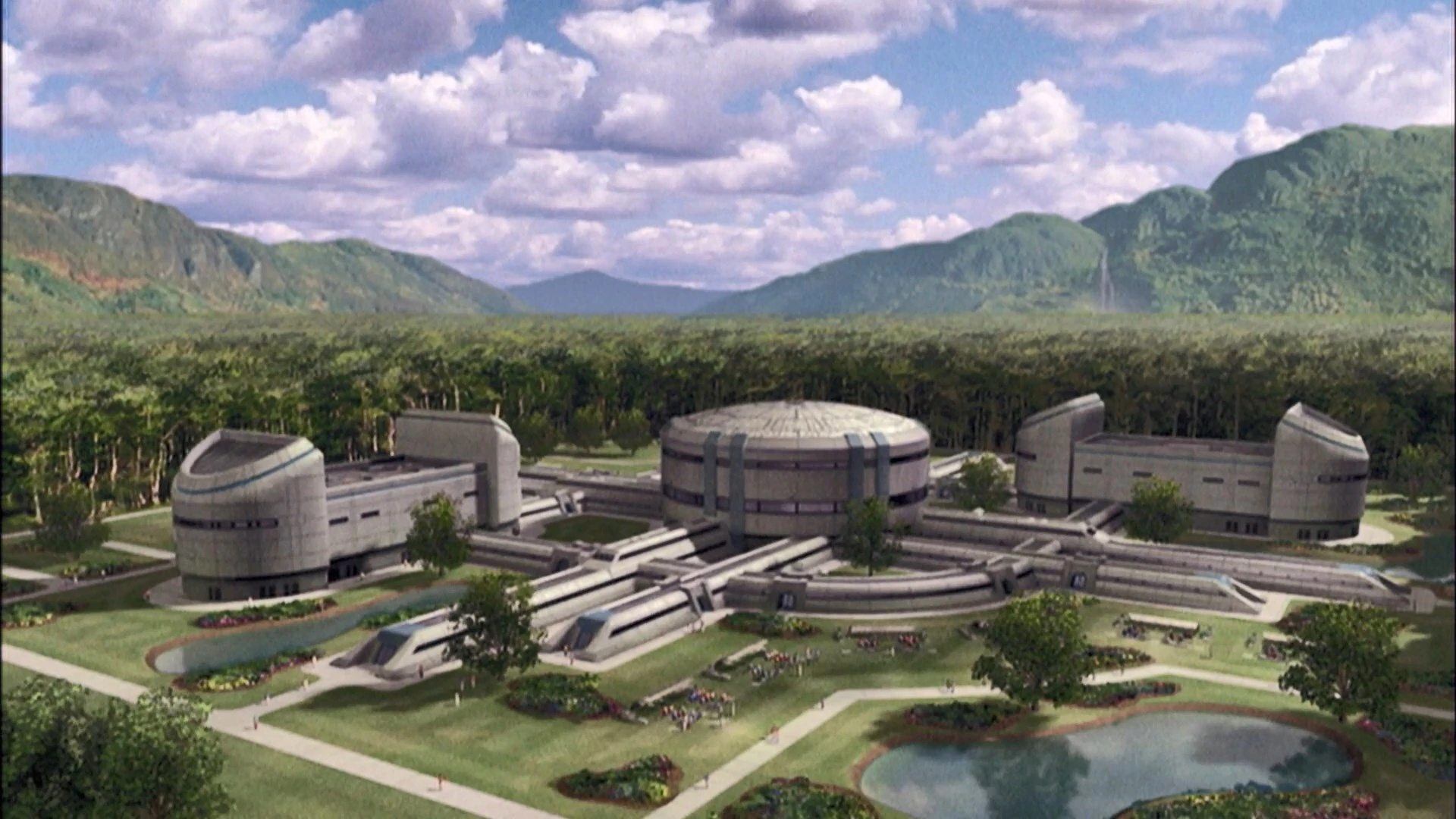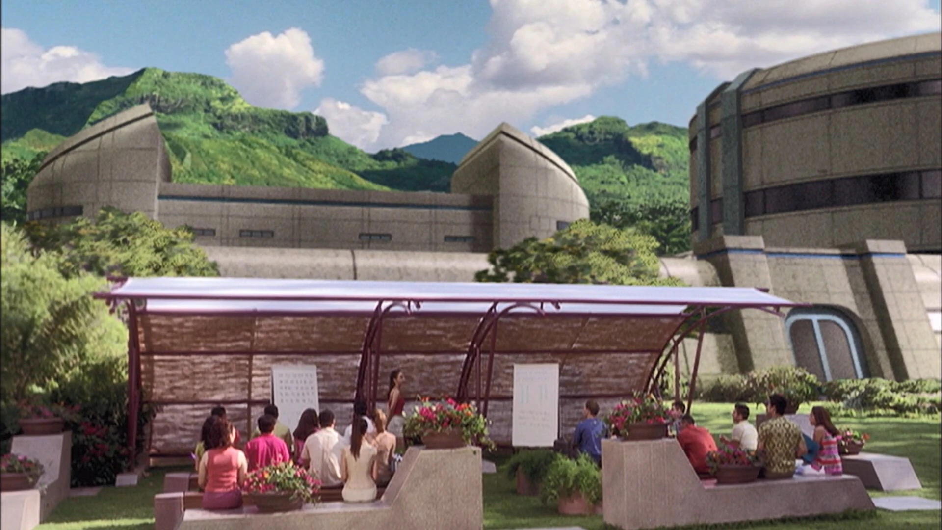 Nota: Nazwa "Amazon University" pochodzi od zmienionego ostatecznego scenariusza "Broken Bow". W tym skrypcie obiekt został opisany jako "Zestaw futurystycznych struktur osadzonych w brazylijskiej dżungli". Chociaż scenariusz odwoływał się również do klasy na dworze miał tablice. [1] W ostatecznej wersji odcinka zamiast tego pojawiają się dwie tablice.