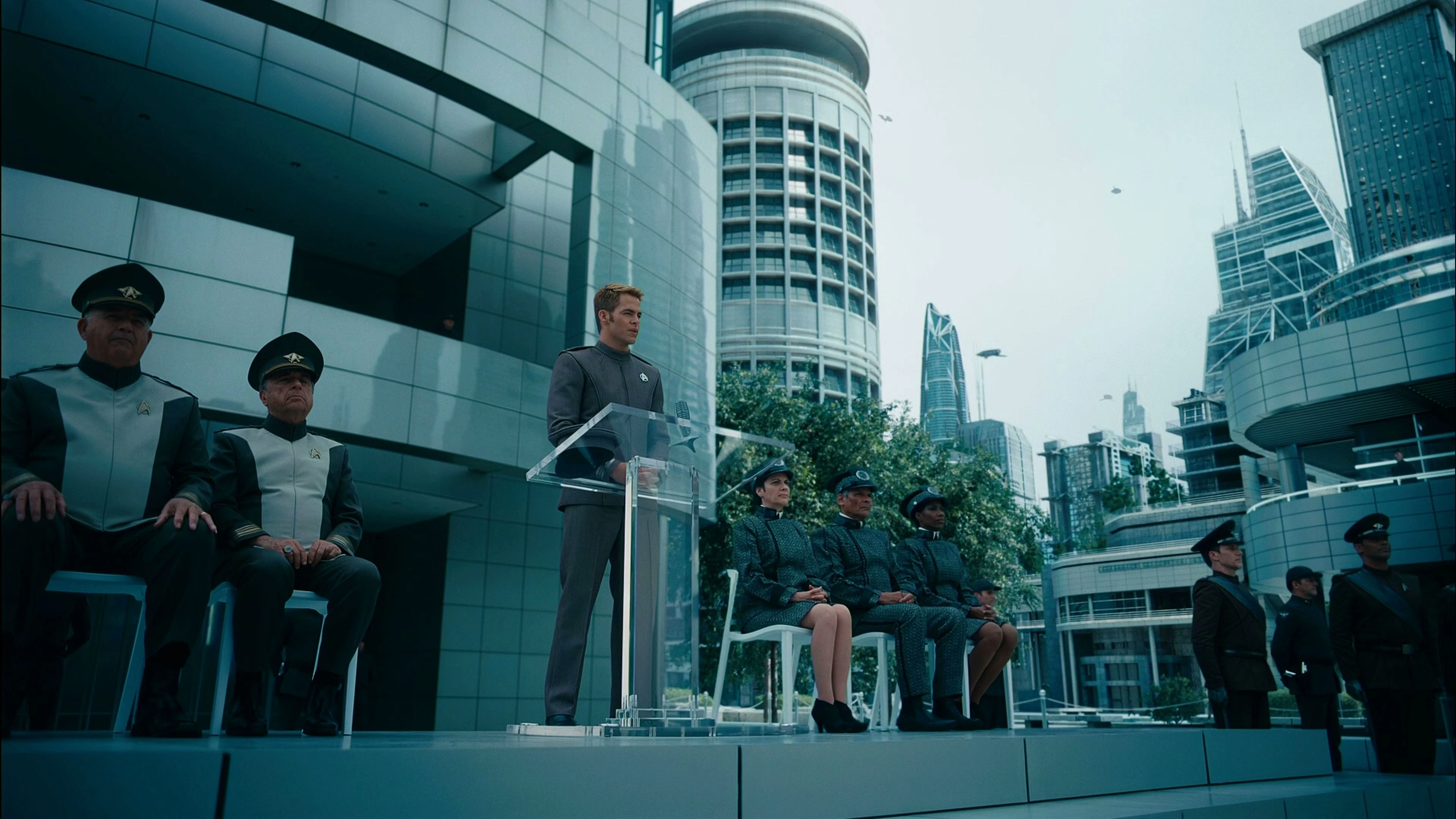 Джеймс Т. Кирк на допросе Совета Академии в связи с его недавним поведением