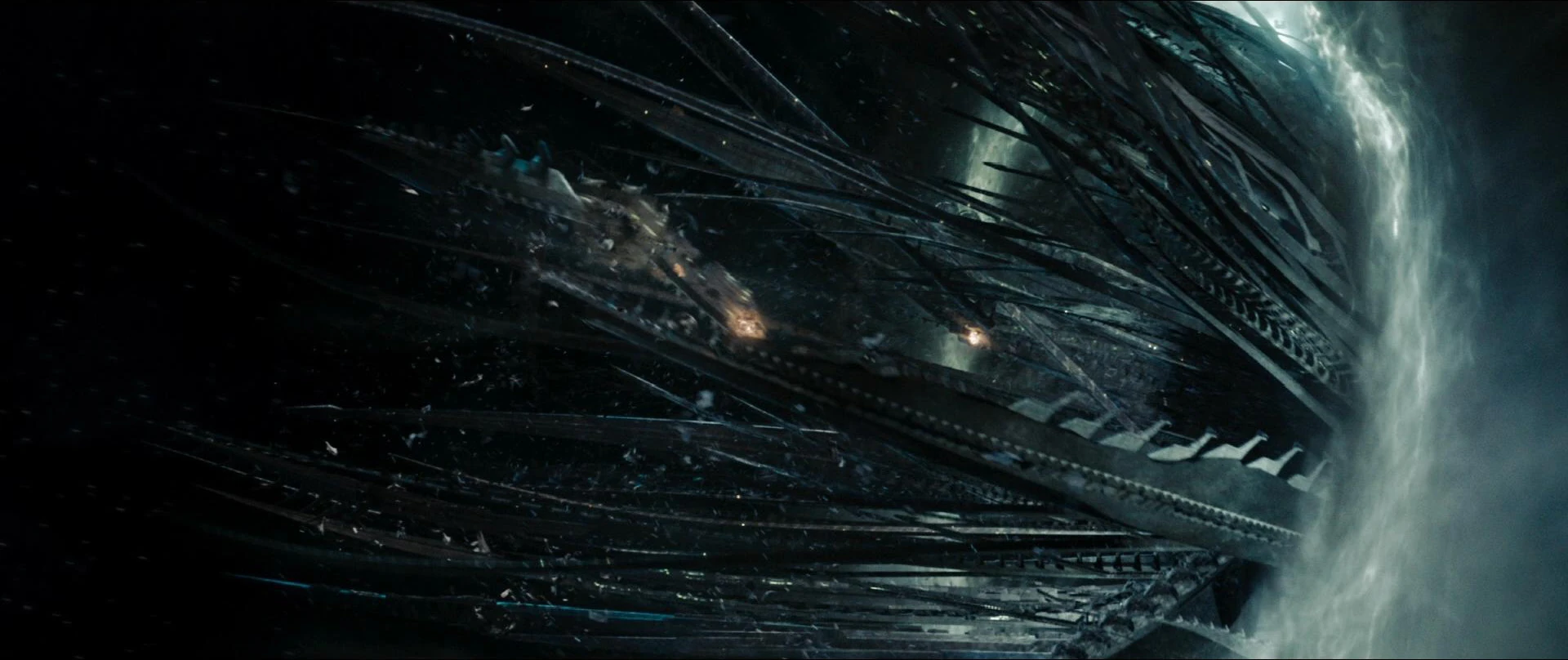 Джей Джей Абрамс хотел, чтобы интерьеры корабля казались таинственными, сделав их "аморфными, чтобы не было углов, потолков или полов". Чтобы свести к минимуму размер декораций, Чамблисс использовал свой опыт работы в театре, чтобы создать декорации, где детали можно было перемещать, создавая новую секцию корабля каждый день. Оператор Дэн Миндел использовал "агрессивное" желто-зеленое освещение, чтобы показать злое и раздробленное мышление ромуланской съемочной группы. Руководитель отдела визуальных эффектов Роджер Гайетт дополнил ощущение, подчеркнув цифровые кадры "в классическом стиле фильмов ужасов", основываясь на тесте освещения, "который прошел неправильно, но мне действительно понравился внешний вид".