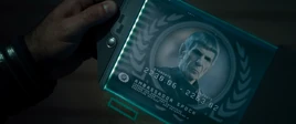 - Спок просматривает тайник с вещами, принадлежавшими покойному послу Споку, и обнаруживает его фотографию со старшим экипажем USS "Энтерпрайз" - около 2287 года на его временной шкале. (Стартрек: Бесконечность)