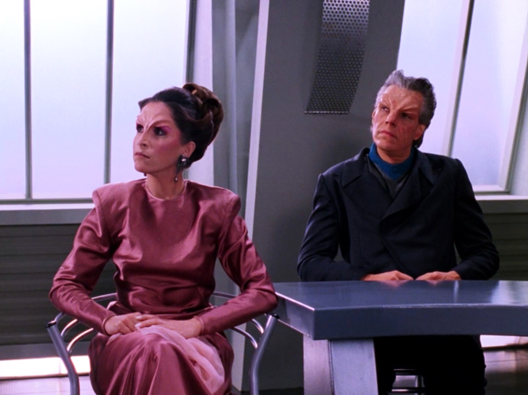 The Federation flagship would be returning the following day, with the hearing of which statement Apgar was less than pleased. But Riker told him that he and La Forge had already arranged for accommodations on the planet below. Manua, however, insisted that they stay to keep her company and further apologizes for her husband's shortcomings in spite of his scientific prowess. Krag interrupts asking if it was Riker's testimony that it was Manua's idea for Riker and La Forge to stay on the station; Riker confirms this and says that it is also the truth.