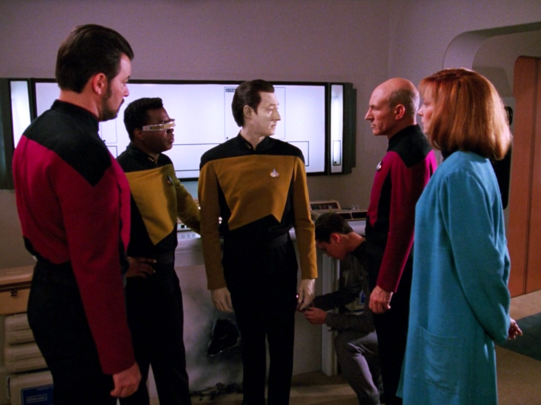 Picard enters the bridge, welcoming Lieutenant Commander La Forge back from the station. The captain asks where Commander Riker is. La Forge replies that he is still on the station where Dr. Apgar is working as Apgar wanted to speak to Riker. Although La Forge replies evenly, Picard notices some tension in his speech, and asks if there were any problems.