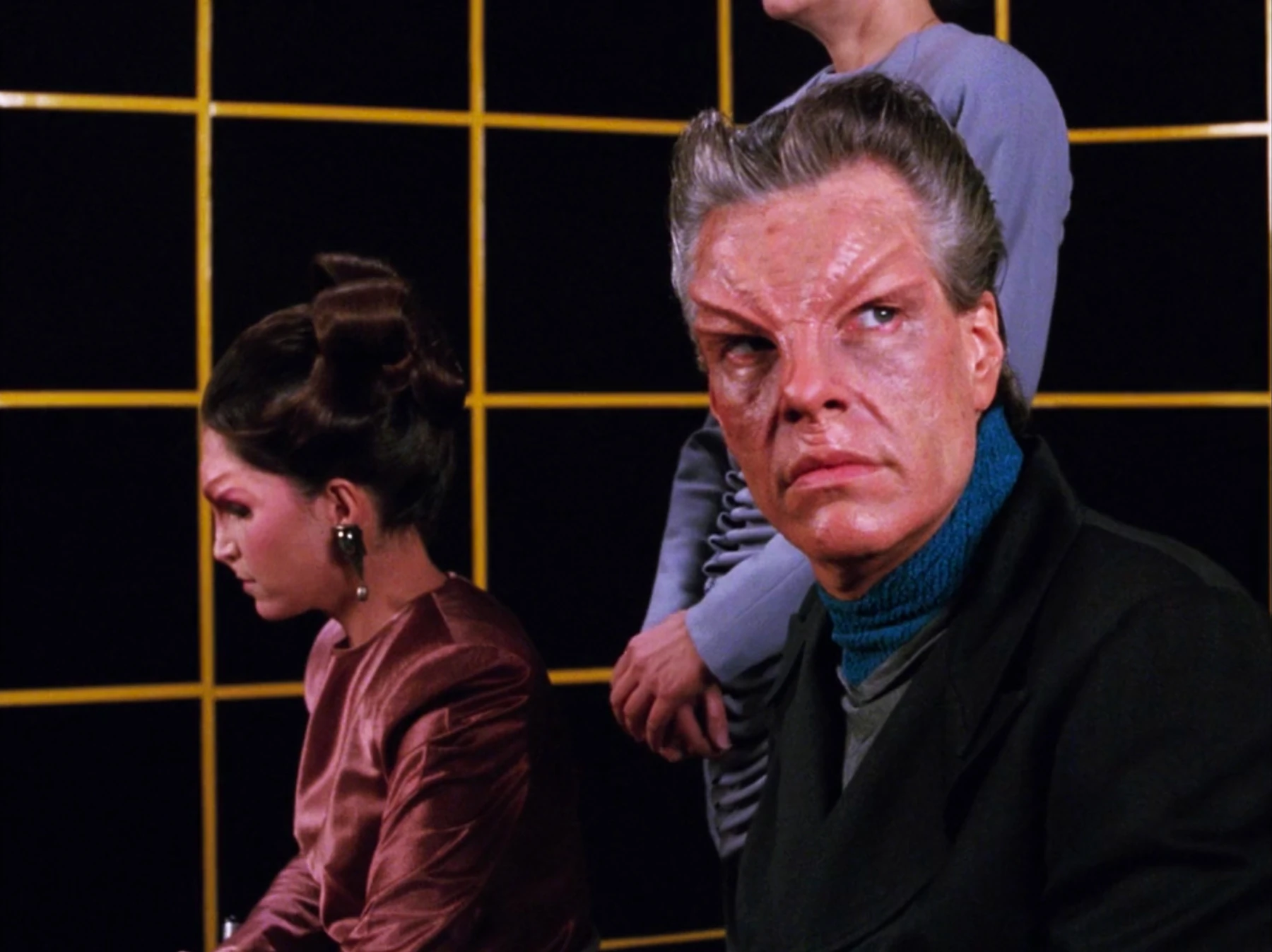 Returning to the holodeck, Krag escorts (the real) Manua Apgar into the room. She is much more modestly dressed, and her demeanor is much less sensual than the hologram of her in Riker's simulation. Before the next simulation is shown, she makes no statement – she just "knows" that Commander Riker killed her husband. Krag runs Manua's recollection of events on board the space station. Holograms of Manua and Apgar appear in their quarters and Apgar is extremely anxious about Starfleet arriving and worries that they will stop sponsoring his research because he feels that he has not progressed as far as expected. Manua tries to assure him that just a bit of charm would be needed to persuade Starfleet to give him more time.