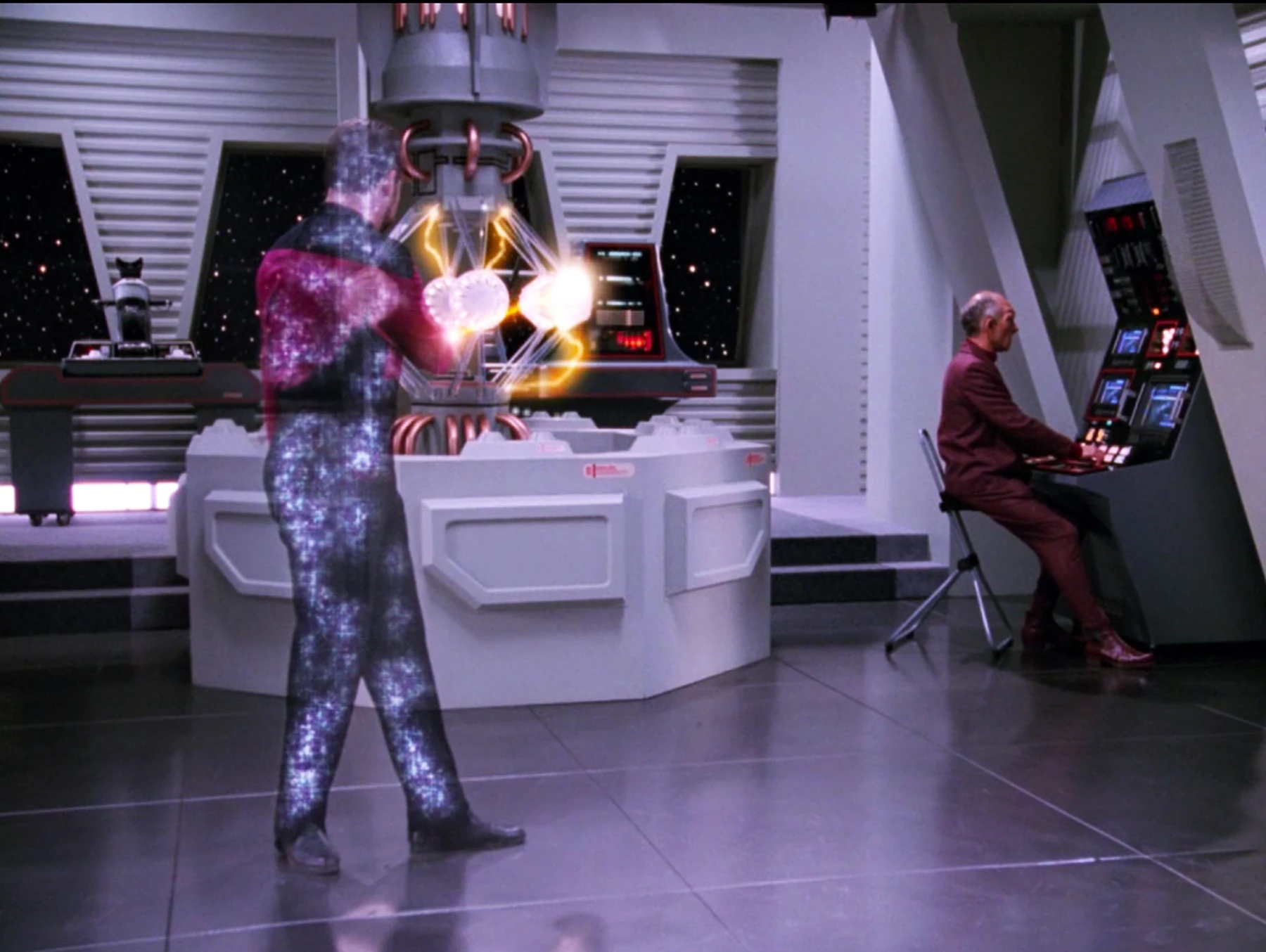 Picard and La Forge then deliver their final effect, running a new simulation that has been deliberately synchronized with the next discharge from the generator. The simulation resumes with Apgar returning to the console that he was working on (as seen also in Tayna's simulation) while Riker calls the Enterprise saying that he is ready to leave. As the transporter beam engages, a Krieger wave beam fires from the generator at Riker's position, but it reflects off the transporter beam into the reactor, resulting in an explosion, destroying everything in the simulation.