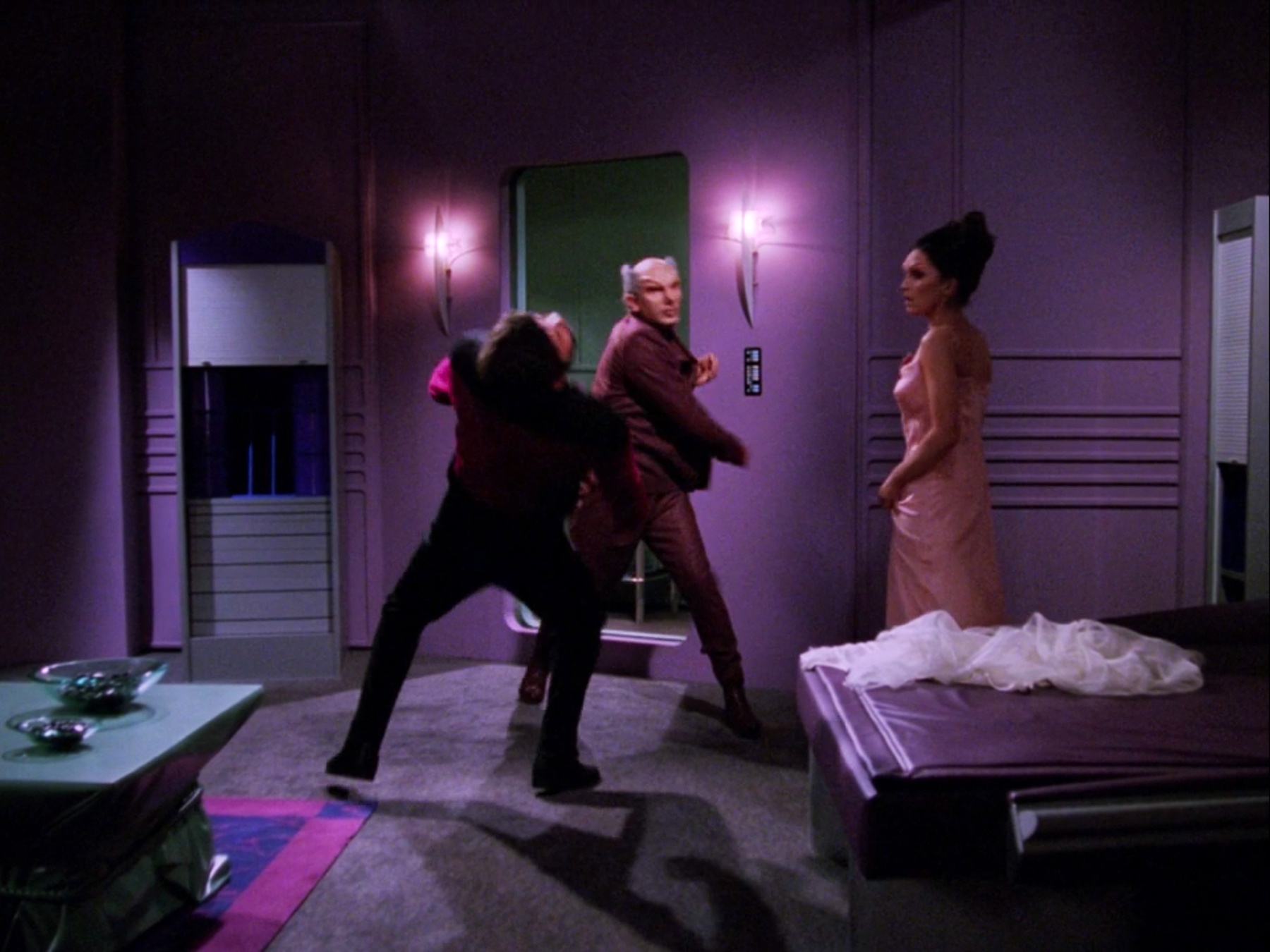The simulation resumes now in the station's guest quarters with Riker and Manua present. Manua shows Riker around the quarters but does not leave and begins to proposition Riker, lowering the light levels in the room and partially undressing. Riker insists that she leave but as he redresses her, Apgar walks in, catching the two in an extremely uncomfortable position. The scientist reacts furiously, hitting his wife and taking a swing at Riker. But Riker moves out of the way of Apgar's punch, and he falls to the floor.