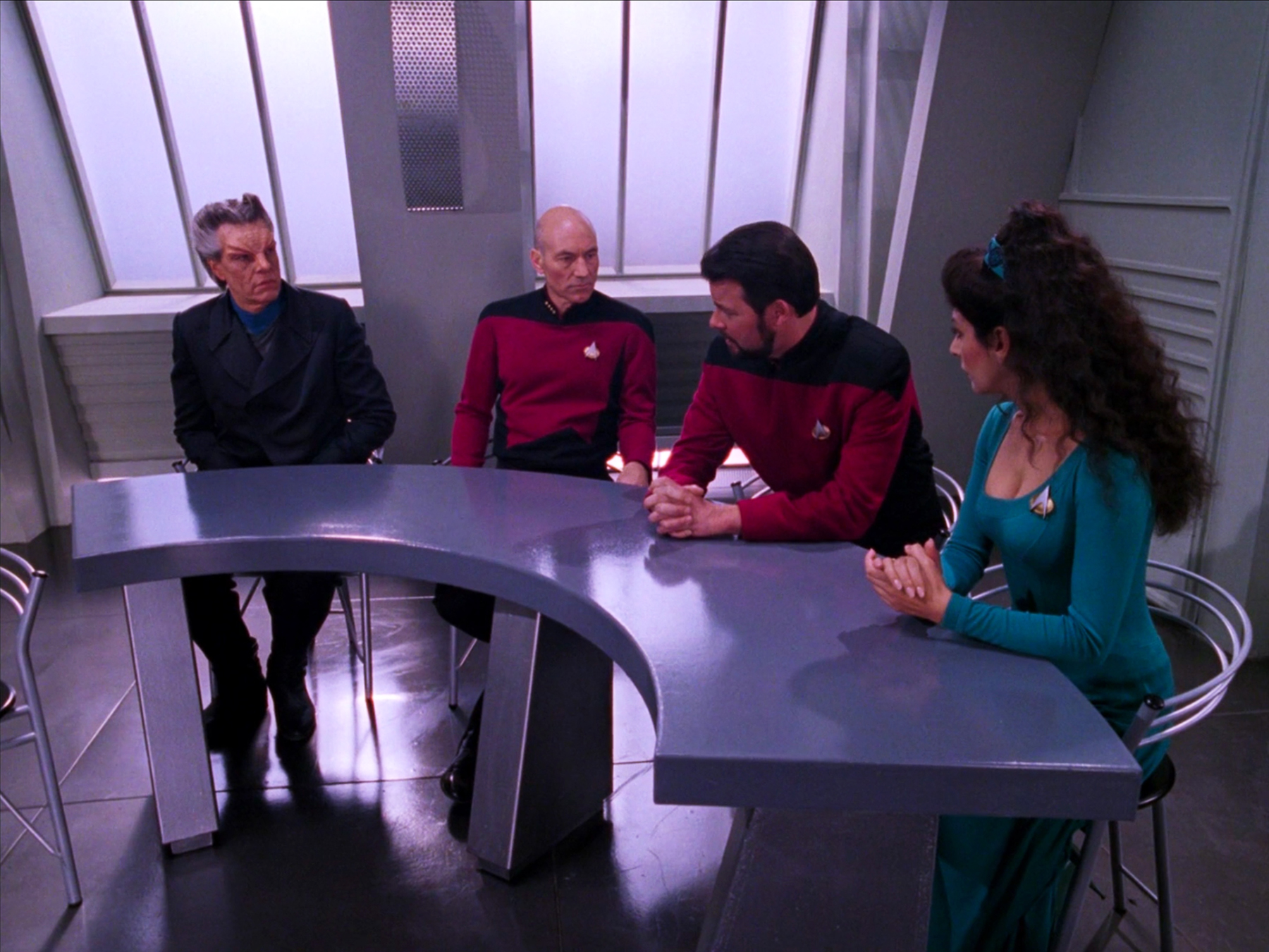 Picard and Troi are in the ready room, and it seems all but certain that Picard will have little alternative other than to hand Riker over to the Tanugans, as the evidence gathered against Riker warrants a trial. Although both he and Troi know that Riker is totally innocent, they cannot yield to their feelings and unfortunately, there is little evidence to prove their friend's innocence. They are interrupted when Data calls them over the com, telling them that the source of the radiation has been discovered; they return to the bridge.