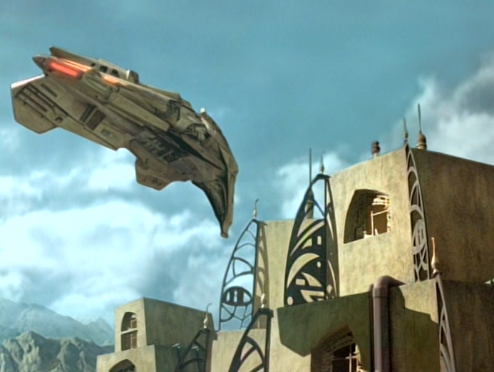 - The Trabe were mentioned in two prior episodes (specifically, in "Initiations" and "Maneuvers") before appearing, finally, in this episode.