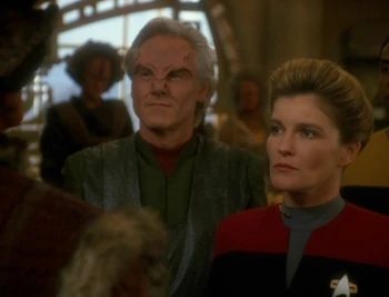 Later in Tuvok's quarters, Janeway tells him of Commander Chakotay's plan to seek an alliance with the Kazon. She tells Tuvok that it goes against everything she believes. The Vulcan tells her that although she is "quite right" in her opinion, Chakotay's suggestion has some merit. He recalls a time when a great visionary named Spock proposed an alliance between the United Federation of Planets and the Klingon Empire. Tuvok himself spoke out against such an alliance, as the Klingons were outlaws, employing violence and brutality. Despite his objections however, the alliance was forged and the Alpha Quadrant enjoyed a new peace between Klingons and Humans. Tuvok tells her that since Voyager is on its way home an alliance with the Kazon would only be temporary, and could in fact end up stabilizing the whole region as the Kazon may come to appreciate peace between the factions. Janeway reflects on this and calls the senior staff to the briefing room for a meeting.
