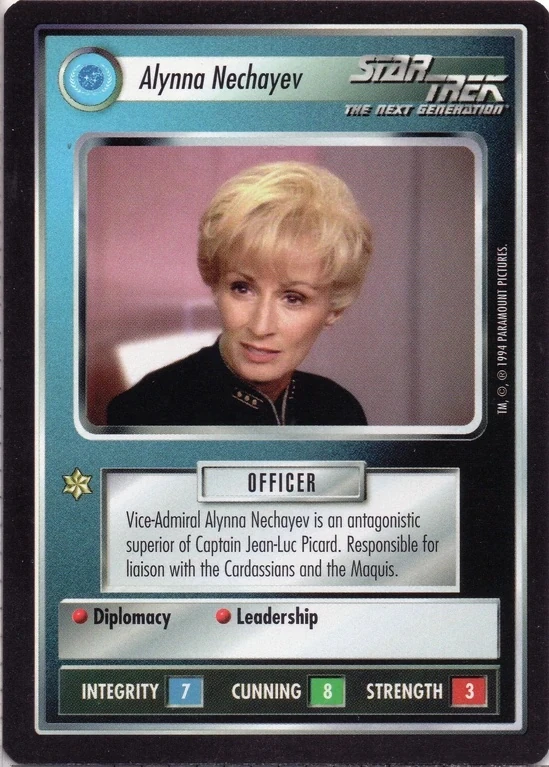 Alynna Nechayev was a Human Starfleet flag officer during the late-24th century. She spent much of the 2360s and early 2370s dealing with issues near the Cardassian border. (TNG: "Chain of Command, Part I", "Journey's End", "Preemptive Strike"; DS9: "The Maquis, Part II")