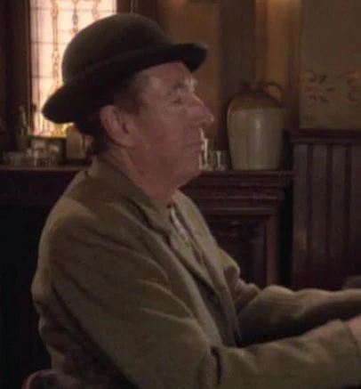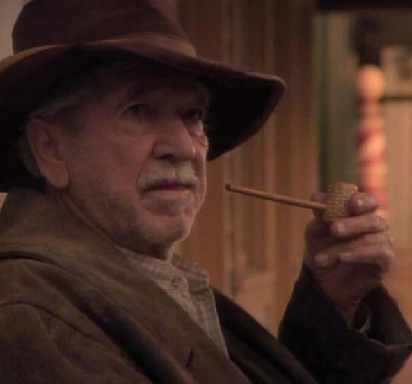 This old man sat in a rocking chair on a porch near the barber shop while he smoked his pipe. He then heard the sound of spurs coming towards him, looked up, and saw Worf and Alexander walking down the street. He later visited the Gold Strike Saloon. (TNG: "A Fistful of Datas")