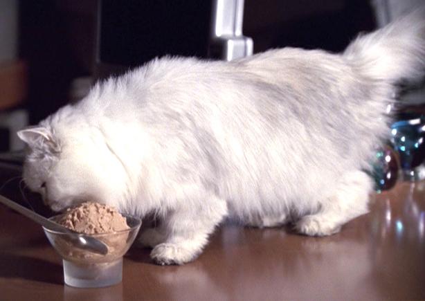 In 2370, Geordi La Forge borrowed Data's cat Spot in order to experience feline behavior before possibly getting his own cat. After the unruly feline broke a vase, a teapot, used a chair as a scratching post, and coughed up hairballs on La Forge's carpet, the engineer happily returned Spot to her owner. (TNG: "Force of Nature")
