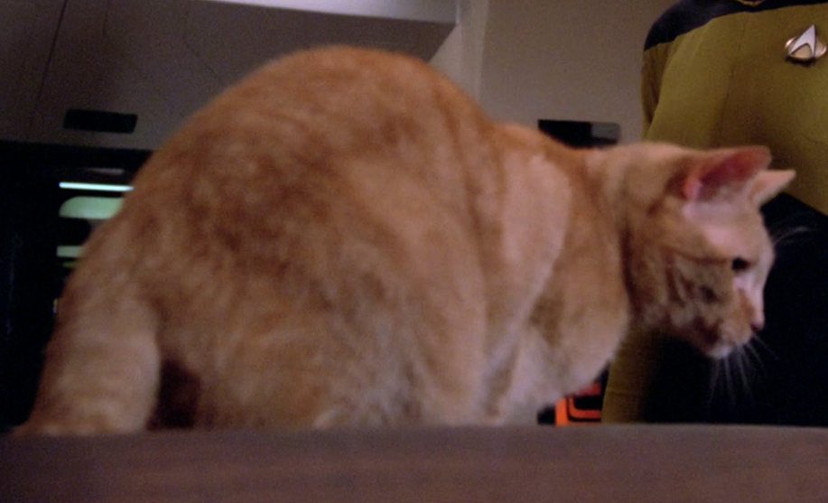 Individuals of this type were often kept as pets among Humans. Examples of cats kept as pets included Spot, owned by Data, (TNG: "Data's Day", "In Theory", "Schisms") Neelix, owned by Reginald Barclay, (VOY: "Pathfinder") and Chester, owned by Liam Bilby and, later, Miles O'Brien. (DS9: "Honor Among Thieves", "Time's Orphan") William T. Riker and LaForge had bad experiences with cats, but Beverly Crusher and Deanna Troi loved them. (TNG: "Force of Nature", "Timescape", "Phantasms")