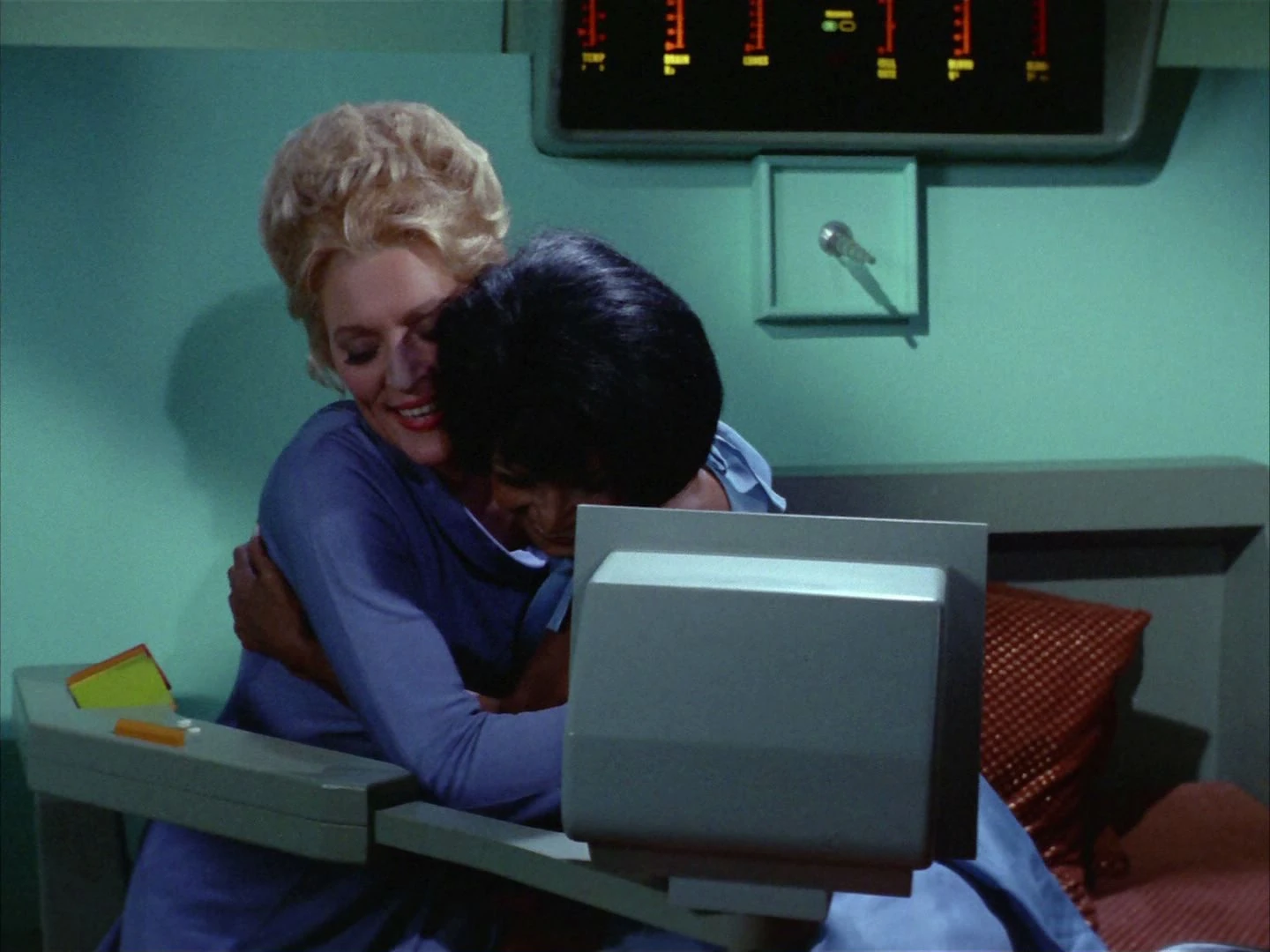 As Chapel departed the bridge to see Roger Korby for the first time in years, Uhura wished her all the best with a sisterly kiss on the cheek. (TOS: "What Are Little Girls Made Of?")