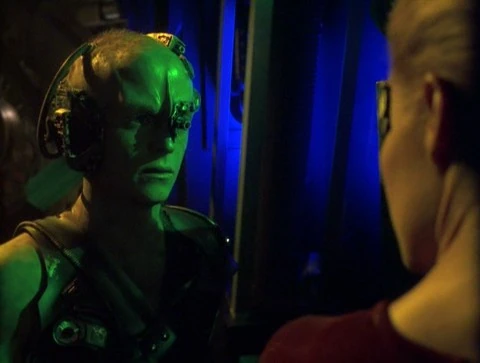 The Borg repeat their intention. But Janeway now knows she is dealing with a lion whose teeth and claws have been pulled. "Not today, and not by you." she replies, and threatens to resume firing if the away team is not released. A brief silence follows, during which cube scans them. Then the response comes: an offer to free the away team in exchange for specific technology, namely Voyager's navigational deflector. Seven informs Janeway that the cube's communications array was damaged; the deflector would allow the five drones to reestablish their link with the Collective. This is the last thing Janeway wants, not that she was even considering the offer at all. She stalls, responding that she would consider the exchange if she is allowed to send over someone to make sure the away team is safe. The drones agree; she can send one person. Her obvious choice is Seven of Nine.