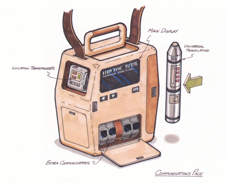 Next, the producers of TNG considered that the characters of the upcoming series wear an unusually large-scale model of communicator. "They said that they should hang a communicator right on the uniform just like the police wear today," reflected Alan Sims. (Star Trek: Aliens & Artifacts, p. 98) In accordance with this request, Sternbach created a concept drawing of a large-scale "communications pack", which was intended to contain multiple wrist communicators. (Star Trek: The Next Generation - The Continuing Mission, p. 40) "That turned out to be too big and not futuristic-looking," said Alan Sims. "You could see police on the street with shoulder communicators so why should that remain the same for three centuries? They went round and round with the communicator." (Star Trek: Aliens & Artifacts, p. 98) Sternbach recalled, "At one early production meeting in 1987, we discussed many possible communicator designs, mostly handheld widgets with Starfleet emblems." Gene Roddenberry looked at these and, moments later, suggested the conceptual breakthrough of combining the communicator with the Starfleet insignia as a badge. (Star Trek: The Magazine Volume 2, Issue 12, p. 45)