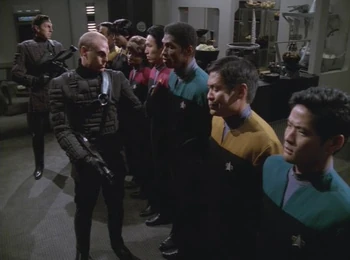 Throughout the ship, the crew has to endure humiliation at the hands of the Devore inspectors who are more than disrespectful. They drop one of The Doctor's cell cultures and probe every part of the ship. In engineering, Prax notices extra power in the transporter systems, but B'Elanna Torres explains it's part of a diagnostic. In the cargo bay, Prax also sees that there is contaminated antimatter which would interfere with their scanning, but takes no action, instead, probing Seven of Nine about her implants, convincing himself she is not telepathic.