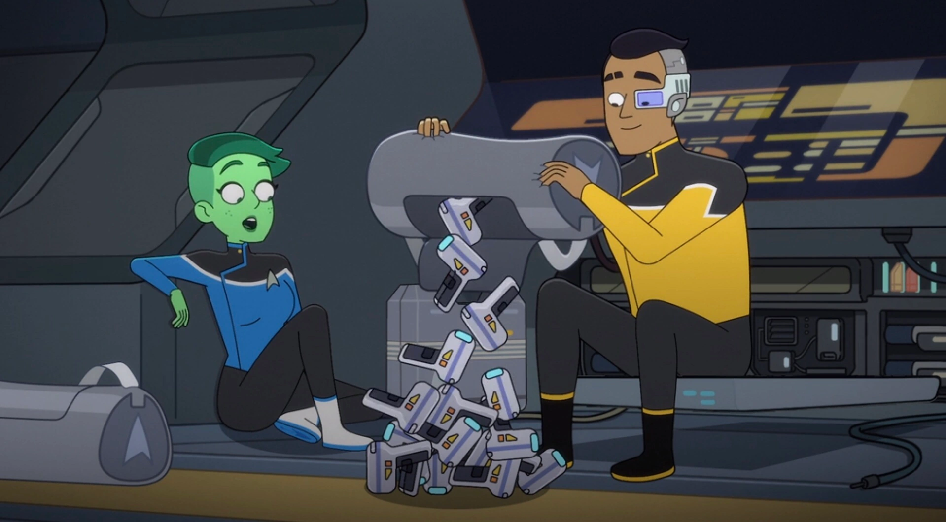 Back in engineering aboard the Cerritos, Tendi and Rutherford are happy to be back, even with the state the Cerritos is in. Tendi then says that before they left the Vancouver she managed to grab a gift for Rutherford. She then fetches a nearby duffel bag and empties out numerous T88s that she managed to steal onto the deck, figuring that the Cerritos needs them more. Rutherford laughs and shows her his own duffel bag, which is full of T88s he stole as well. Tendi and Rutherford laugh at the situation and note that this is why they are such good friends.