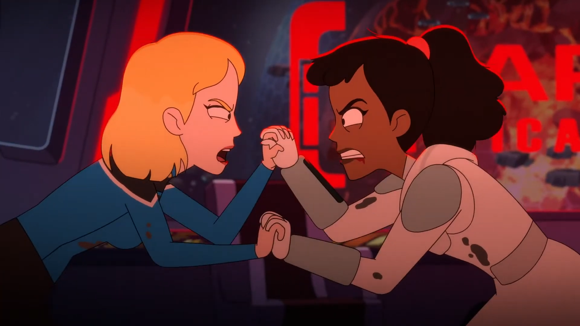 On Platform Gamma, Mariner is fighting Brinson, who is holding her own. Mariner refuses to let Brinson hurt Boimler, and Brinson says that she's protecting him from Mariner. Brinson is unable to believe that Boimler's and Mariner's conflicting personalities allowed for them to become friends. She had similar suspicions of Mariner not being Human and came to the conclusion that Mariner is a parasite. Mariner simply accuses Brinson of being the parasite, and they continue fighting.