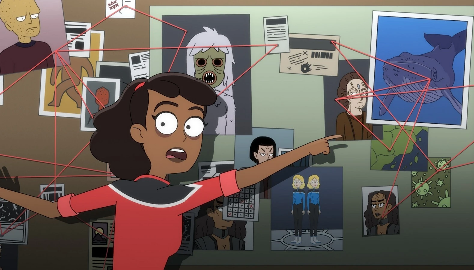 Meanwhile in a corner of the repair bay, Mariner is trying to eliminate the possible alien races that Brinson might be, speculating that she might be a surgically altered Cardassian spy, a transporter clone, or a Suliban, but Boimler tells her to stop and asks her to accept Brinson for who she is: a great Human lady. He then goes to a replicator and asks the computer to analyze the coolest people in Earth history and replicate an outfit that combines traces of each in a small size.