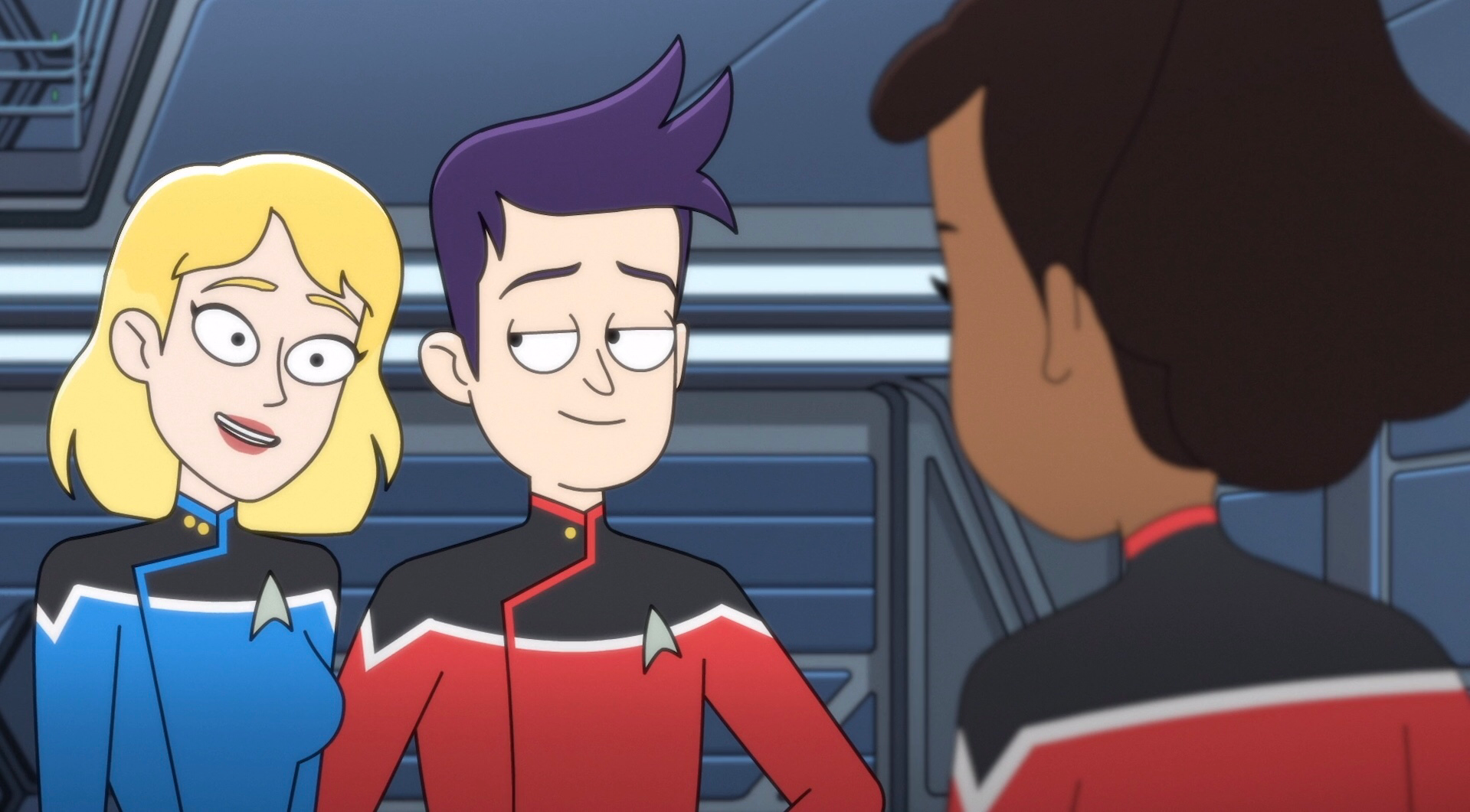 As they tour the Vancouver, Brinson discusses her experiences on the ship, and talks about how she met Boimler, and that despite never thinking she'd get involved in a long-distance relationship, she took a liking to him. At that moment, another Cerritos crewmember, Lieutenant Jet Manhaver, approaches them and informs Brinson that they will be working together. The two are happy to see each other, and Boimler immediately feels threatened by his presence. Manhaver informs them that the diplomatic crisis with the people of Mixtus II and III has postponed the implosion of the moon, and that they have to recalibrate the containment field around the moon. Realizing that this task will interfere with their lunch date aboard the Cerritos, Brinson apologizes as Manhaver heads off to engineering. When Mariner asks how they know each other, Brinson replies that she and Manhaver used to date each other long ago, but that Manhaver is nothing compared to Boimler. In the process she mentions that Boimler's first name is actually 'Bradward', which Mariner was unaware of. She and Boimler kiss again, before she excuses herself and heads to engineering as well. Mariner admits to Boimler that Brinson is indeed great but wonders to herself if she might be too good to be true.