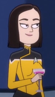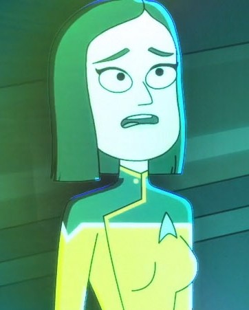 She was in engineering with Rutherford when Mariner called Rutherford from the USS Rubidoux for an emergency beam out. She then watched the emergence of a space vessel lifeform from the hull of the Rubidoux through a Cerritos viewing port. (LD: "Much Ado About Boimler")