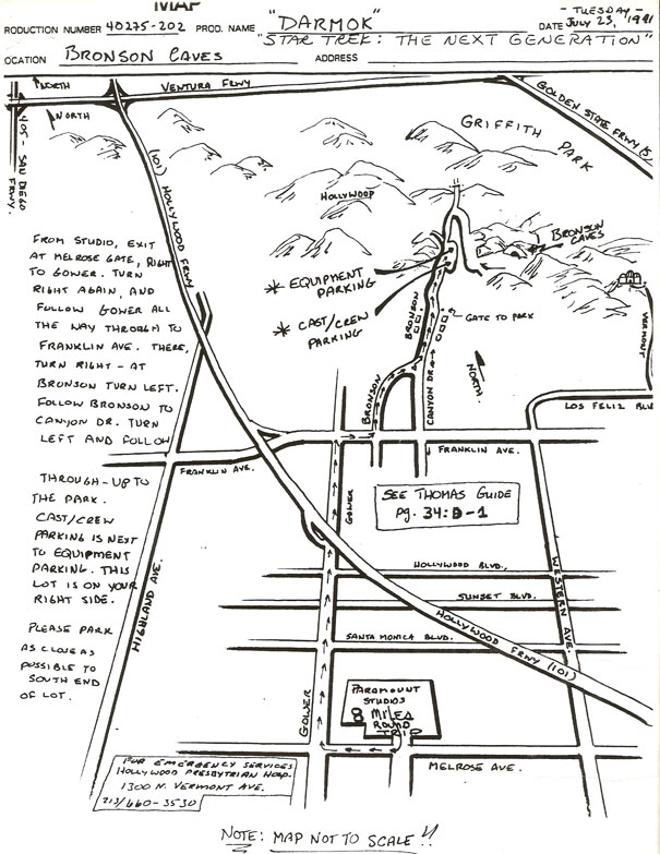 - "Darmok" was filmed between Thursday 18 July 1991 and Friday 26 July 1991, on Paramount Stage 8, 9, and 16, as well as on location at Bronson Canyon. An additional day was Thursday 8 August 1991, on which the blue screen unit filmed the creature scenes with stuntman Rex Pierson on Paramount Stage 9. Second unit for this episode filmed on Monday 26 August 1991, on Paramount Stage 9 and 16. When the following episode "Ensign Ro" returned to location at Bronson Canyon on Monday 5 August 1991, another sequence was filmed for "Darmok", involving Rex Pierson and photo doubles Ron Large and Lanier Edwards. Photo double Dana Vitatoe filmed additional second unit shots on Wednesday 28 August 1991, on Paramount Stage 9.