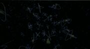 - The protons that batter Voyager are shown in a display that, like that of the Big Bang, is a highly stylized rendering. (Star Trek: Fan Collective - Q text commentary)