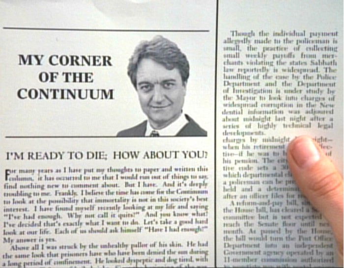 Quinn then picks up a copy of The New and shows one of its articles to Janeway. Titled "I'm Ready to Die; How About You?", it was written by Quinn and was the beginning of his fall from grace. Quinn explains that although the magazine was shut down after the article, Quinn continued to speak out in favor of his suicide and the Continuum was so scared of him that they locked him away in the comet, displaying that the Continuum only favors an individuals rights as long as they don't conflict with the state. Quinn feels his life's work is complete, yet the Continuum has forced immortality on him and as a result he feels his life is cheapening alongside that of the Continuum. Quinn then asks Janeway that, if there was no more space left to explore, no new discoveries left to be made and nothing else to do, would she really want to live forever under those circumstances? In response to Janeway asking him to equate how he suffers in relation to pain or disease he tells her the disease is immortality and that when an immortal's life is futile and no longer endurable then it should be allowed to end.