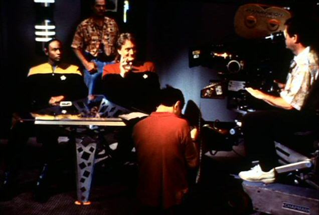 - The set used for the hearing in this episode was the briefing room minus its usual large table. As the briefing room table was bigger than any of the room's doors, Leslie Frankenheimer's set dressing crew had to pull out one of the room's walls to remove the table. (Star Trek: Fan Collective - Q text commentary) This episode's text commentary – written by production staffers Michael and Denise Okuda – speculates that, aboard Voyager, the vessel's crew probably either dismantled the table before they could take it out of the room or that they simply beamed it out.