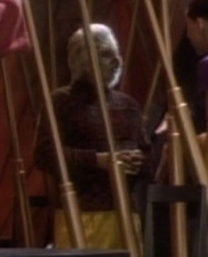 This alien, with no apparent neck and heavy folds over its eyes, was among the residents of Deep Space 9 shortly after the Cardassians withdrew from the station. It was dressed completely in blue and wore a hood. (DS9: "Emissary")