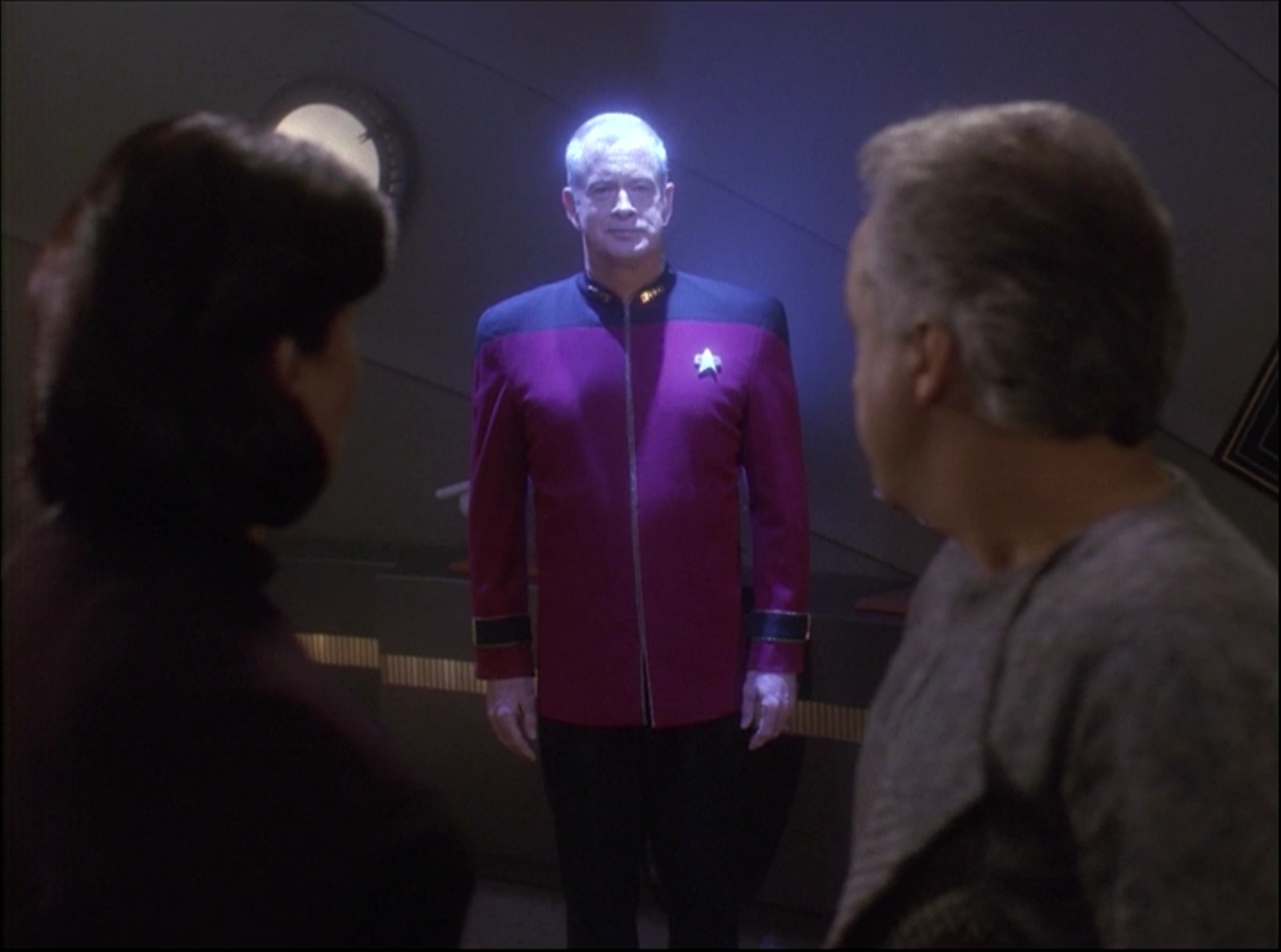 Rear Admiral Bennett appears via holoprojection to sentence Bashir and his parents.