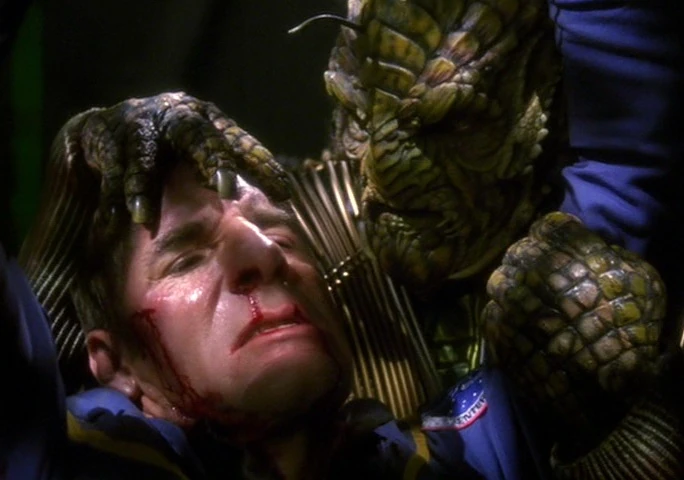 When this Xindi-Reptilian character debuted in the third season opener "The Xindi", he was not yet named. The character (ultimately called Dolim) was portrayed by actor Scott MacDonald. He at first did not have much background to base his performance on. Having played various other Star Trek parts, MacDonald found that Dolim's aggressive temperament was one of the factors that set the character apart from those earlier roles. "This guy's just a villain, and there's a straight-forwardness about Dolim that I love," MacDonald explained. "I drive this guy forward vocally, physically and mentally like a battering ram and see what happens." (Star Trek: Communicator issue 151, pp. 48 & 47)