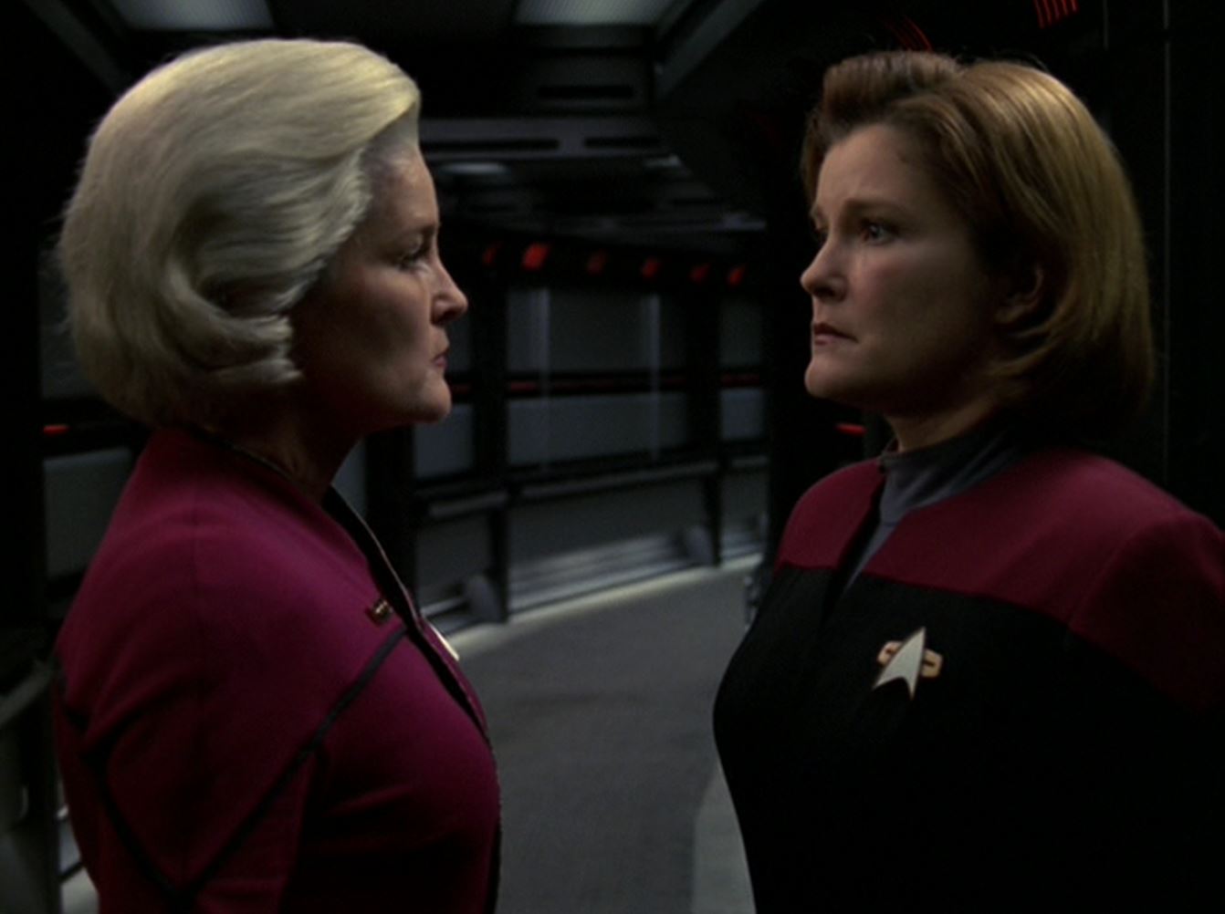 Admiral Janeway sternly tries to assert her superior rank, but to no avail; Captain Kim tells her that Barclay informed Joe of what she is up to, and Joe told him. He repeats the order. She agrees, on the condition that he let her explain why she is trying to do what she is.