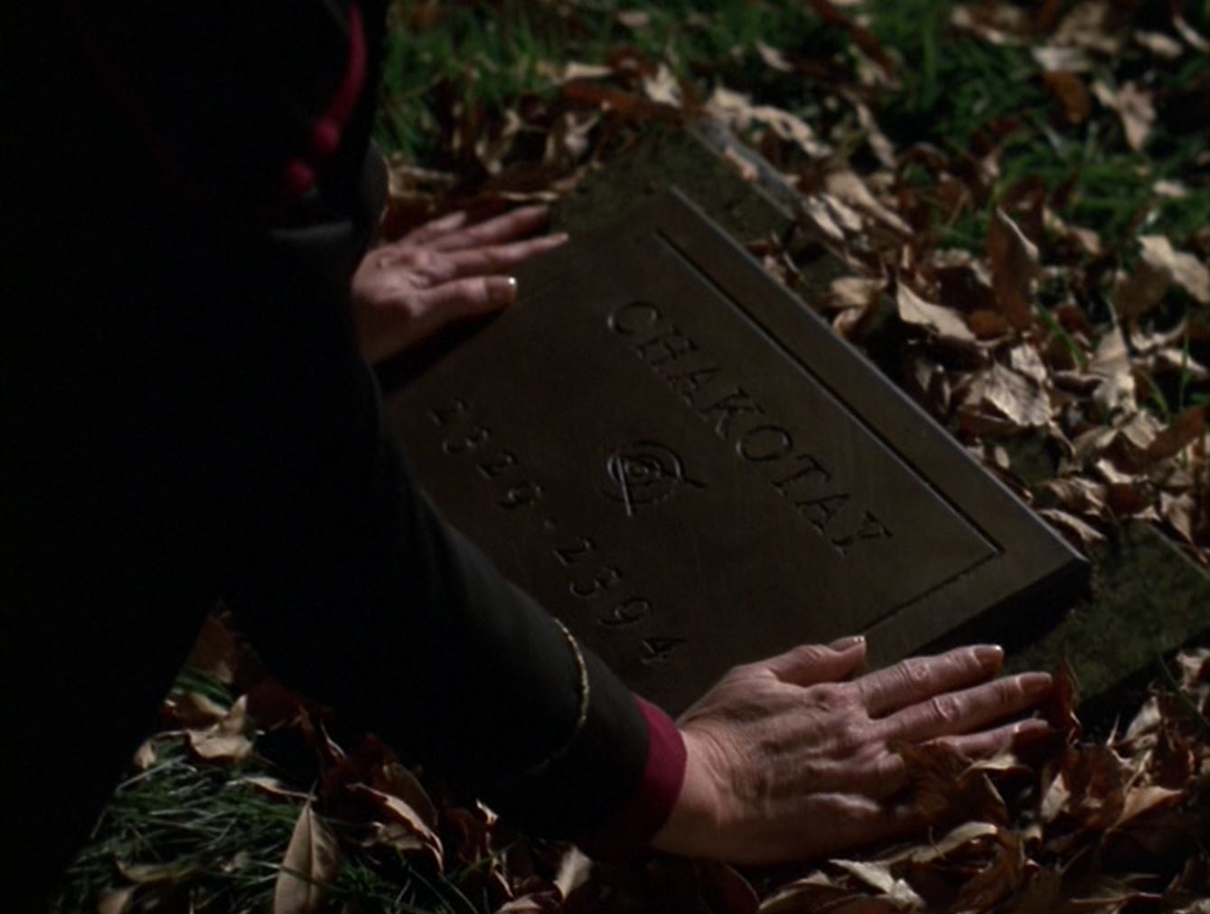 In an outdoor area, Janeway speaks down to something on the ground. She kneels and rests her hands down on a gravestone: CHAKOTAY 2329 – 2394. "I know it wasn't easy living all these years without her, Chakotay," she says. "But when I'm through, things might be better for all of us. Trust me." She rises and leaves.