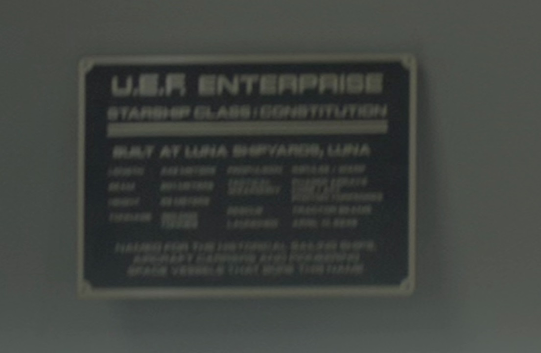 The USS Enterprise-E's dedication plaque was located on the bridge, outside the port-aft turbolift. (Star Trek: First Contact; Star Trek: Insurrection; Star Trek Nemesis)