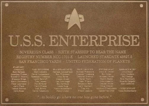 The following information was listed on the dedication plaques of starships named Enterprise. (Star Trek: Enterprise; Star Trek: The Original Series; Star Trek: The Next Generation; Star Trek films set artwork)