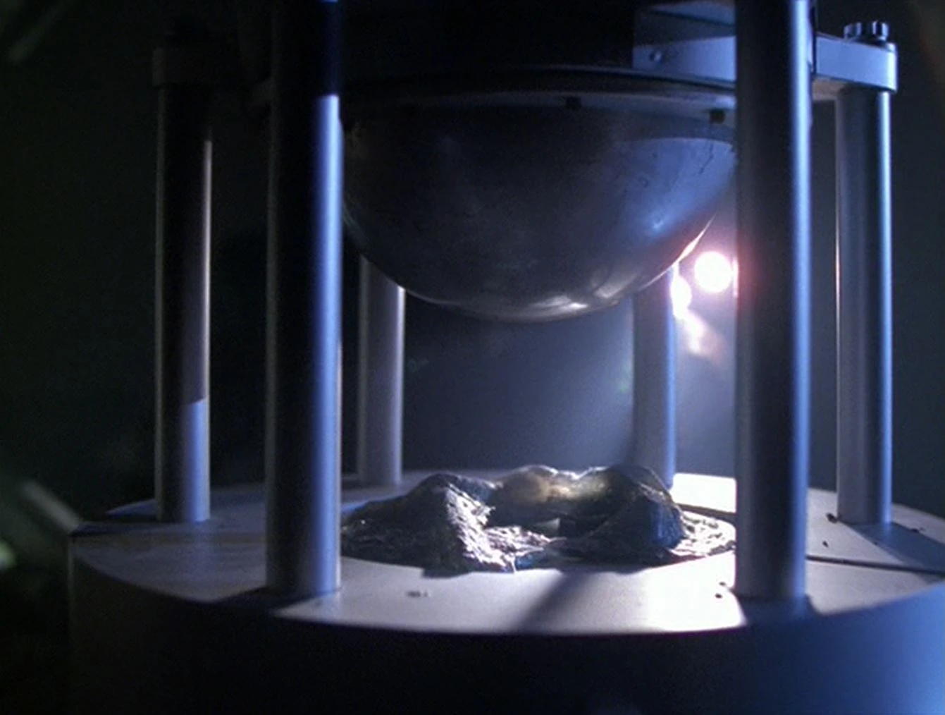 The lab contains the force field equipment which was used to intentionally trap the aliens, so that they would die. The Doctor determines this was not for defense but to use their bodies to boost the warp engines' power, due to their high nucleogenic energy content. The Doctor finds other equipment to convert the remains into a crystalline compound that the engines could use, once modified. The Equinox crew has been intentionally killing the aliens to use them as fuel in order to get home more quickly. Janeway is immediately informed.