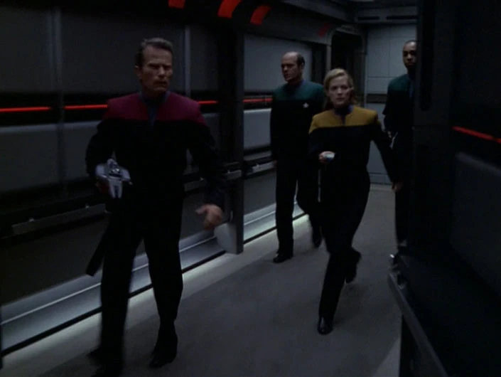 On Voyager, Ransom and Burke discuss final preparations for their plan. But they run into two of Voyager's security officers, who have been instructed to detain them. The pair try to head for a transporter room, but instead meet an armed Tuvok, accompanied by more of his security officers. He informs Ransom Janeway wishes to speak with him. Ransom goes without resistance.