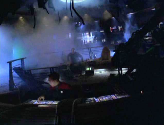 As this is being done, the same dry, high whine from before is heard again, as Seven of Nine reports the opening of portals – interspatial fissures – on several decks, including the bridge deck, Deck 1. Tuvok finishes adjusting the shields, and a single, large shield surrounds both Voyager and the Equinox, then becomes invisible, indicating the attack has ceased. This is confirmed by Seven's announcing the fissures have vanished, and the ending of the noise. Janeway hails the Equinox, but gets no answer. She orders Chakotay to assemble rescue teams to beam over.