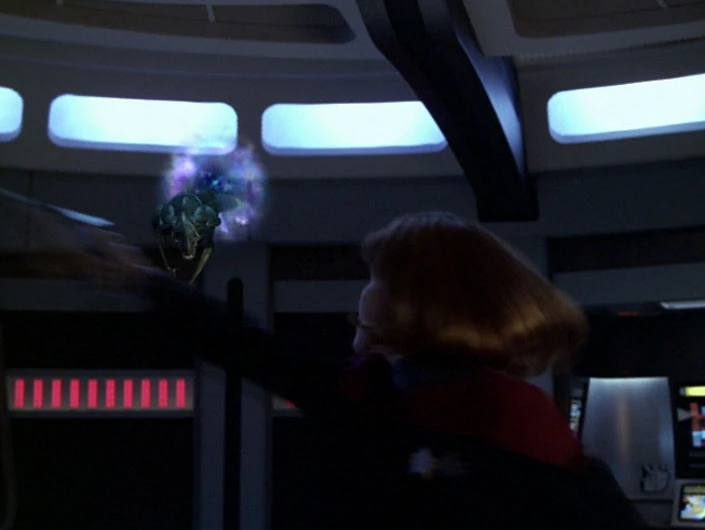 Janeway then goes to the bridge and orders The Doctor to return to the lab and retrieve all the data he can find on the aliens. She also orders Seven to go to the Equinox's engine room and take the modifications off-line. She intends to make contact with them and explain that Ransom and his crew will be punished for what they were doing to them, and thus convince them to stop their attacks. Chakotay has Gilmore decrypt the Equinox's engine modification schematics in the astrometrics lab, and Seven beams over to begin dismantling them.