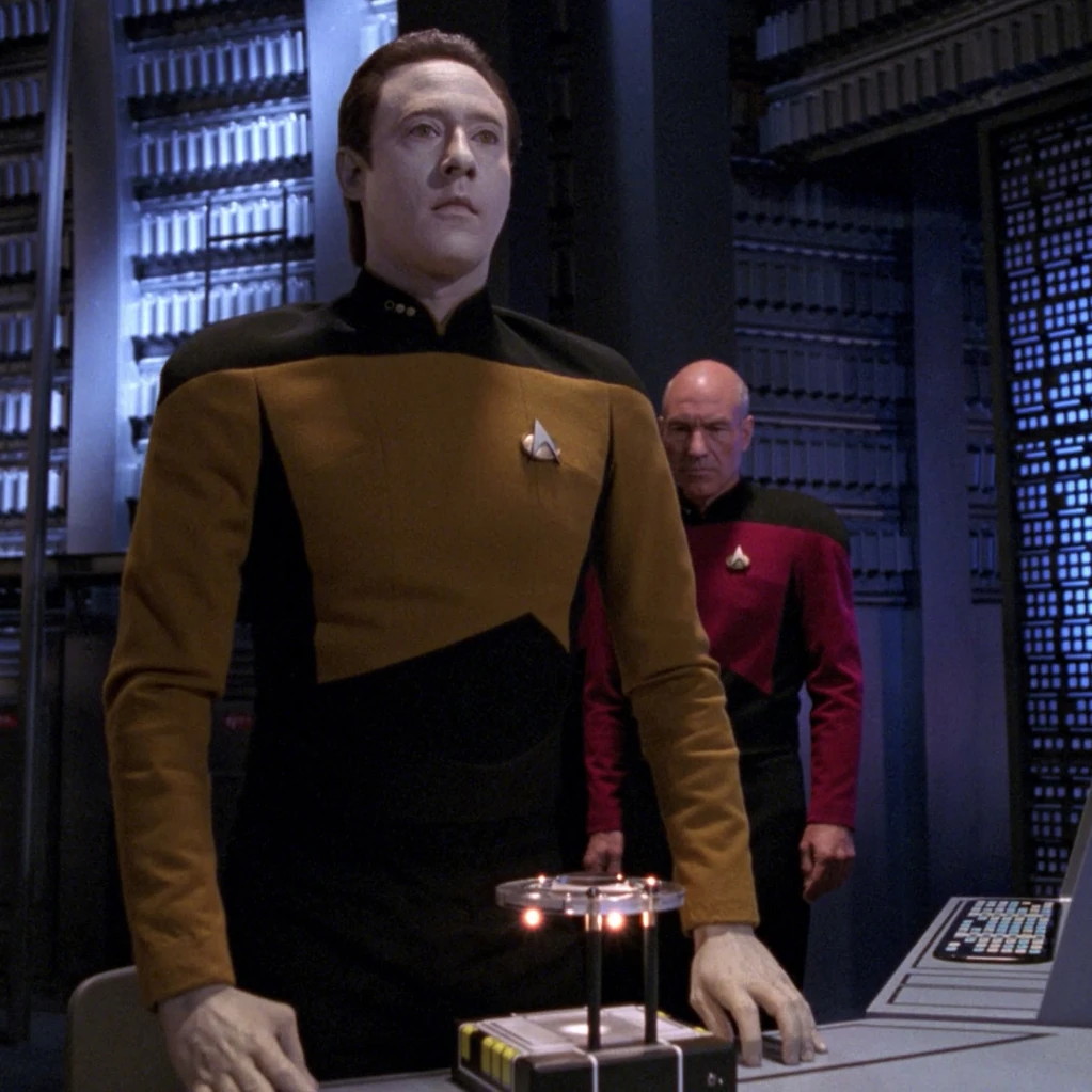 Picard, Riker, Worf, Data, and Stubbs are now down in the computer core, where Data is making preparations for the transfer. He places his hand on a piece of equipment and the nanites enter his body. His head suddenly jerks up and haltingly looks around, as the nanites experience the world as Data does for the first time. "You are very... strange looking creatures," they say. The captain explains that he and his crew have encountered even more creatures, perhaps even more strange looking than them, and that they seek to live peacefully with them. The nanites ask why they were attacked. Picard tells them that that they misinterpreted their actions as an attack.