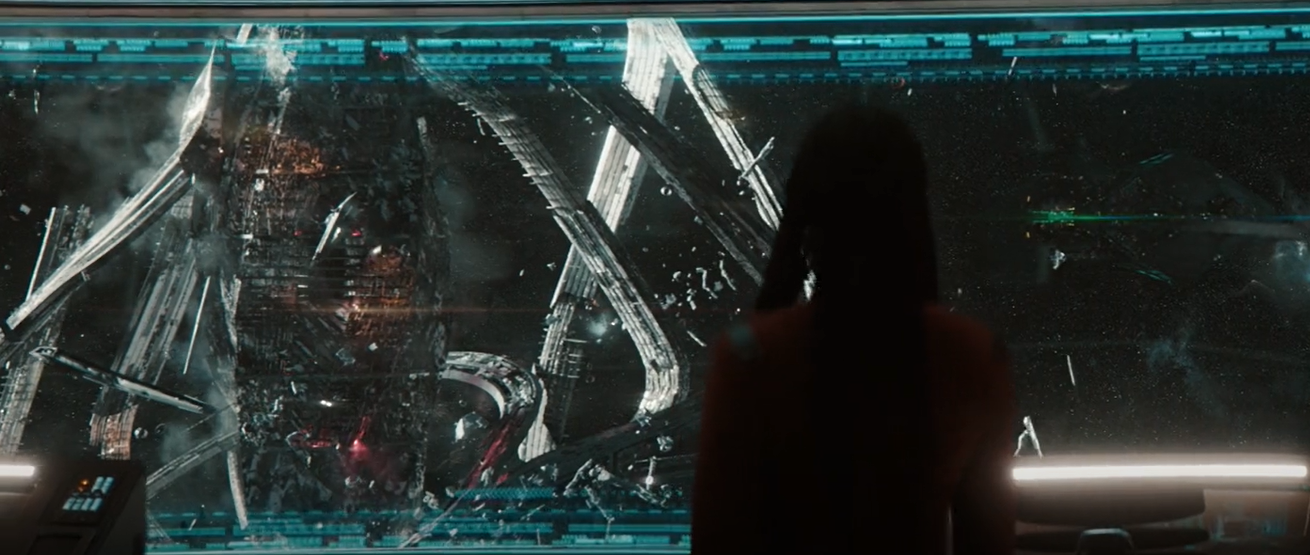 Time cycles again and Burnham and Rayner land in a damaged ready room with flickering power, blackened windows and dust covering every surface. Rayner notes that it seems like no one has been here in years while Burnham is unable to even get a stardate from the computer which is glitching like it's on its last legs. The two hear "Que Sera, Sera" playing faintly in the distance and follow it to the deserted bridge which has blast shields covering the glitching viewscreen. The source of the music proves to be Zora who asks if it's really Burnham or if this is just another dream because Burnham and the rest of the crew died decades ago. Burnham reassures the AI that it's really her and Zora reveals that it's now 3218 which is almost thirty years into the future for Burnham and Rayner. Most of Zora's memory is gone so she can't recall the exact details, but the outcome that Burnham had feared came to pass: the Progenitors' technology fell into the wrong hands, and everyone died. On Burnham's orders, Zora opens the blast shields, revealing the destroyed remains of the USS Federation outside.