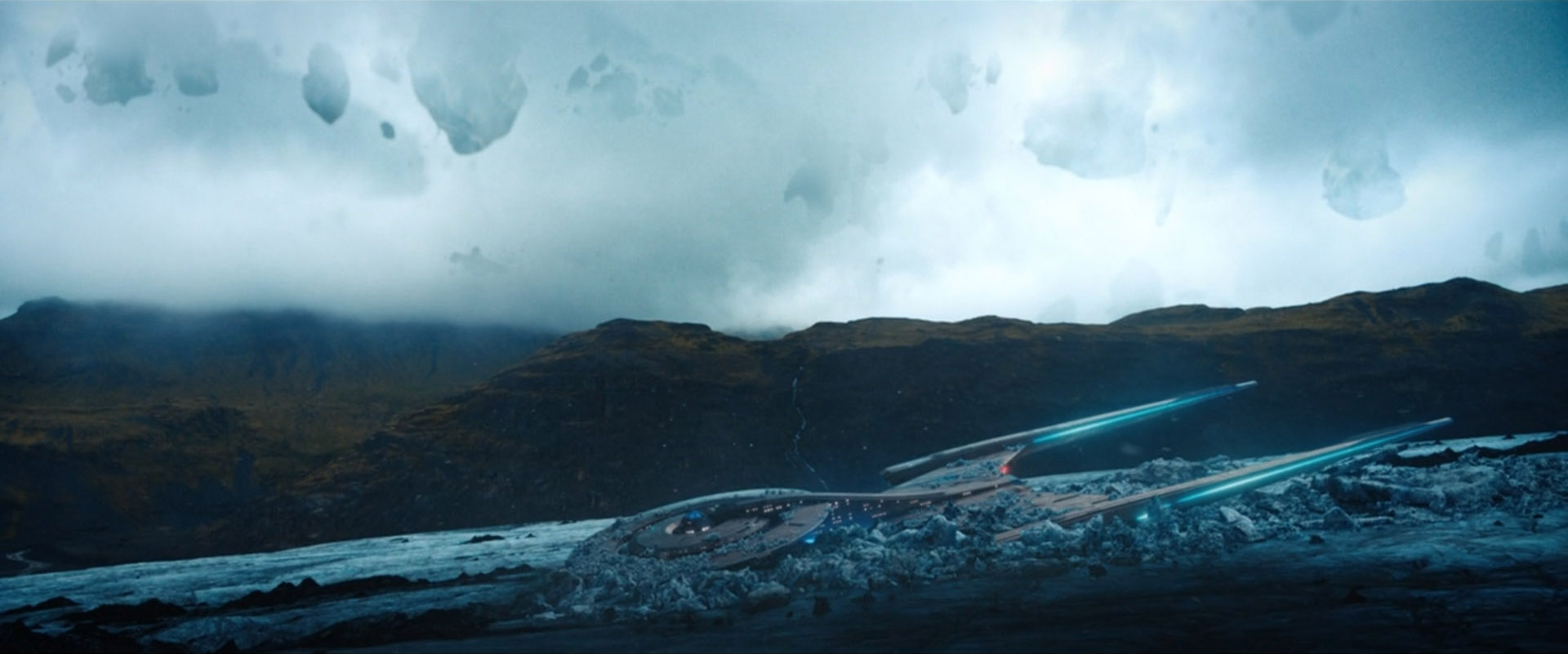 Discovery plows straight through an asteroid covered in trees and falls toward the planet. Approaching a glacier on the planet's surface, Gen Rhys fires a graviton beam to soften the ice and cushion the impact. After hitting the ice, the ship's deflector shields fail and the ship slams to a halt, jolting many crew members and throwing Lieutenant Keyla Detmer over a console. The ship rests atop the glacier, groaning from damage, with large chunks of ice resting atop the hull.