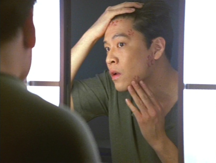 During the night, Kim has a strange dream while asleep in his quarters and when he awakens, he goes to his bathroom to find he has a strange rash all over his face.