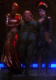 Quark himself was later involved in an even more significant instance of cross-dressing, one which thereafter fundamentally altered the nature of Ferengi society. After Grand Nagus Zek attempted to give women the right to wear clothes, he was immediately displaced from power by Brunt, and forced to set up a government-in-exile on Deep Space 9. While there, Zek tried to convince top Ferengi businessmen to join him for a conference to demonstrate the intelligence of women, using Ishka as his exemplar. When she collapsed after suffering a heart attack, Quark had to fake being the female "Lumba", so as to impress Nilva, an ultra-conservative manufacturer of Slug-o-Cola. Quark received gender reassignment surgery for the occasion, which was reversed afterwards. Quark's "Lumba" sufficiently influenced Nilva to call for, and get the immediate reinstatement of, Zek as Nagus. Zek's women's rights agenda therefore continued. (DS9: "Profit and Lace")
