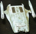 George and Goodman embellished the model by endowing the ventral side with several add-ons that had their origins in AMT/Ertl Star Trek model kits. So did the model feature two nacelle caps with Bussard collectors of the Enterprise-D model kit (No. 6619) as well as warp nacelle from the Romulan warbird model kit (No. 6858). Unfortunately for them, no dorsal views were seen of their model in the movie, though the tips of the Enterprise Bussard collectors were.