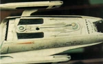 The studio model of the SD-103-type, built especially for The Undiscovered Country was purely an initiative of Industrial Light & Magic (ILM), the company contracted to do the visual effects for the movie, since scene 24 of the movie script did not foresee in one. The concept originated from the brain of ILM's Visual Effects Art Director Bill George, when he was conceiving a visual effects shot for the movie. He clarified, "When Kirk and the others head up to the spacedock to reboard their ship, we really wanted to open the film up and show the grandeur of space. Immediately I thought of 2001 – in particular, the docking sequence between the Orion space clipper and the double-wheeled Space Station One. I also got the bug in my mind to do an angle on the spacedock that hadn't been done before. I looked at at the model from all angles, and eventually ended up lying down on the ground to look up at it before I realized that was the perfect shot – it hadn't been done before, plus it was the natural angle of approach if you were coming up from Earth." George decided to beef out the shot with a new shuttle model. While Paramount Pictures had shuttle models available from the previous outings, The Search for Spock and The Final Frontier, George decided nevertheless to have a new one built. This was partly due of George being a consummate modelmaker (he had started out at ILM as such) and, though it was strictly speaking not his job anymore, he could not refrain himself from building another one, as studio model requirements were very light for ILM on this particular outing. All other models featured in the movie, including some on which George himself had previously participated in their builds, were reuses from earlier productions. He had John Goodson design one, and together they build the model, or as he has put it, "We designed and constructed a new shuttlecraft model just for this shot, the only new model we got to do this time. It was done very quickly – in a week – and was about sixteen inches long." (Cinefex, issue 49, p. 48)