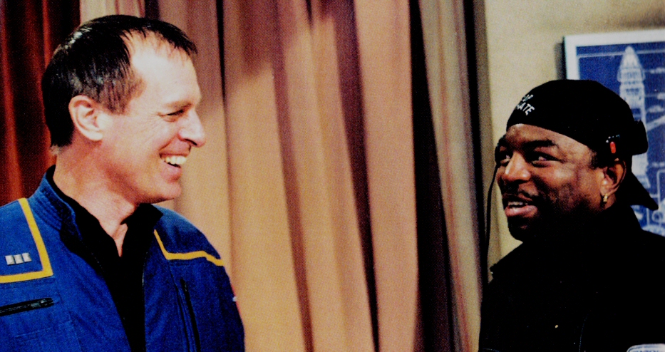 LeVar Burton with actors Scott Bakula and Connor Trinneer as well as a trio of sailors from the USS Enterprise (CVN-65)