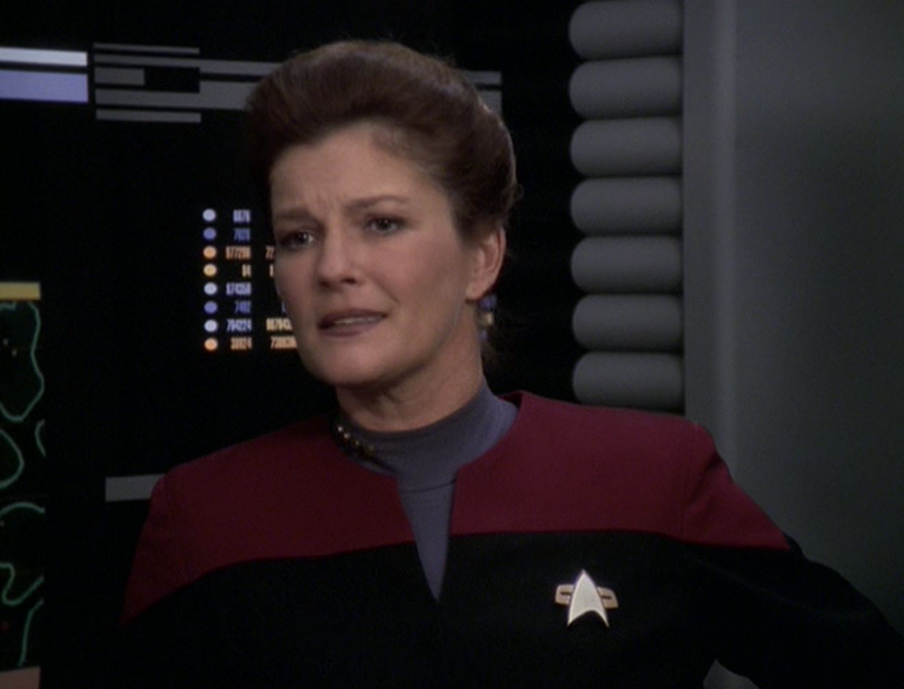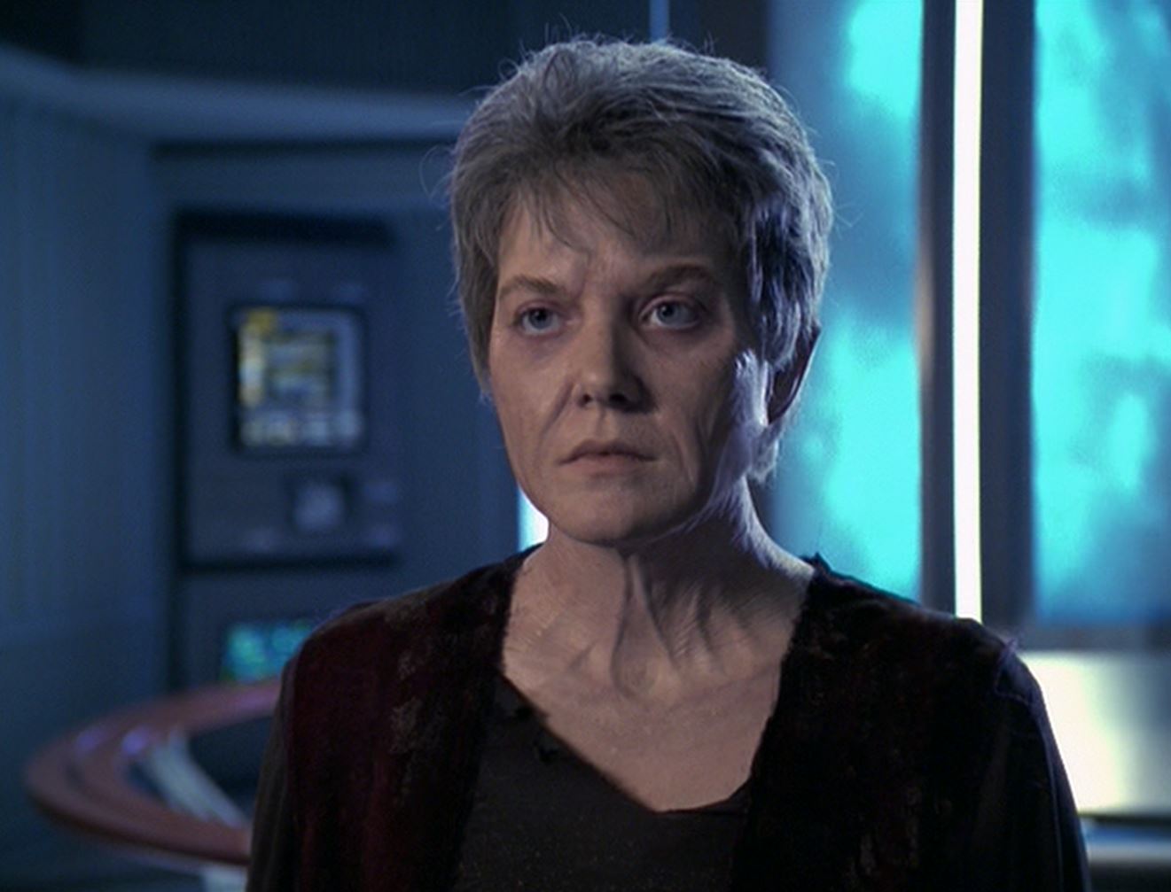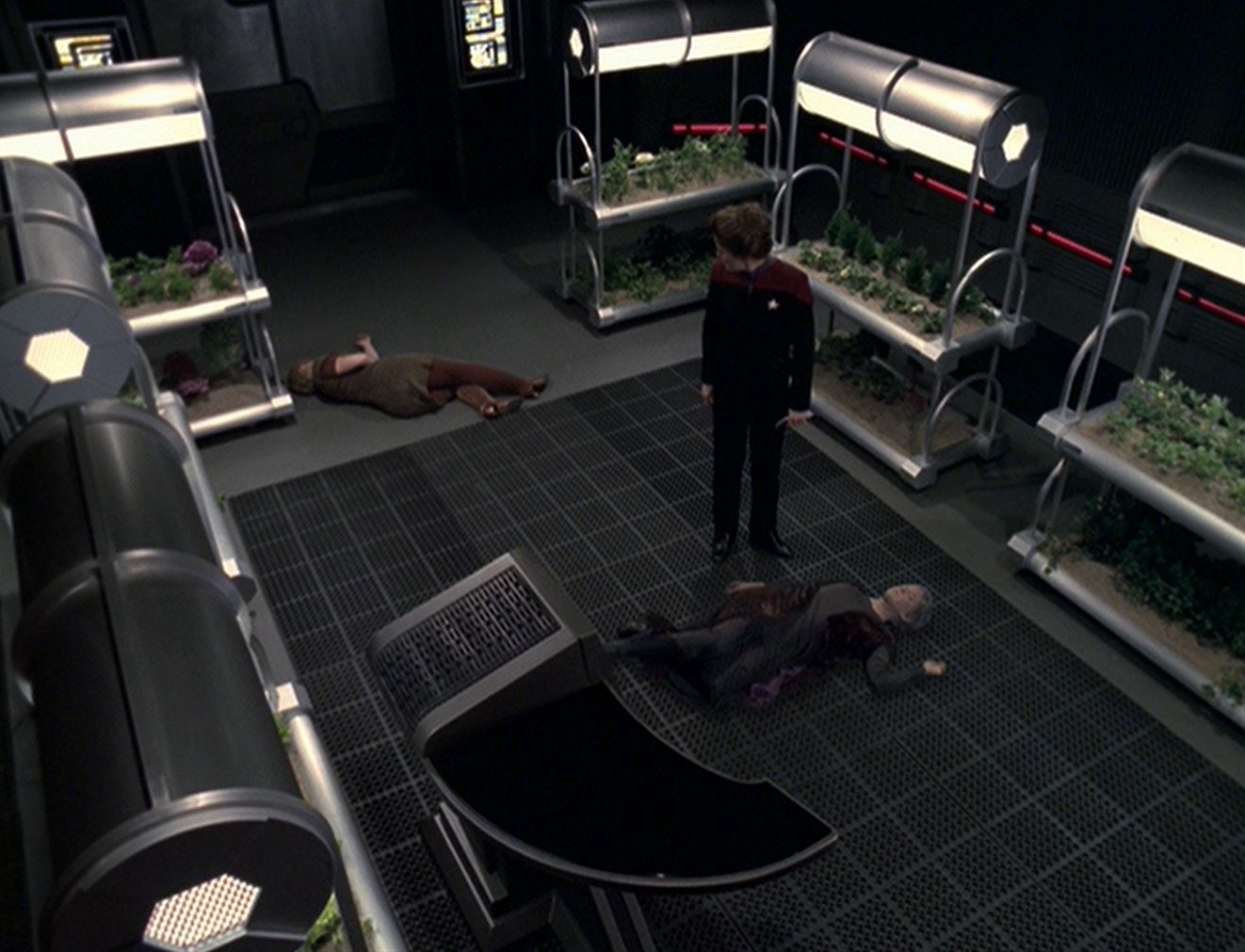 Kes is back in airponics checking up on her younger self whom she apparently has hidden in one of the drawers. After finding everything okay she heads over to a computer console to ascertain Voyager's tactical information where she bypasses the command authorization by using her powers.