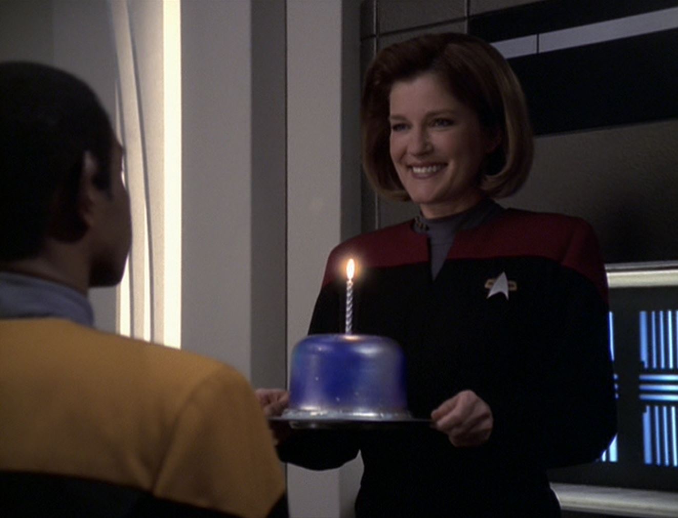 Janeway presents Tuvok a birthday cake